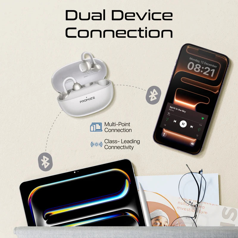 Experience next-level audio freedom with the AirClip-Pro, the AudioFit open ear true wireless stereo earbuds designed for comfort, clarity, and all-day performance. Unlike traditional in-ear designs, these innovative open-ear clip-on earbuds provide a stable, lightweight fit that lets you enjoy your favorite music while staying aware of your surroundings. Featuring Bluetooth 6.0 and advanced multi-point connectivity, AirClip-Pro seamlessly pairs with two devices simultaneously, allowing smooth switching between phone calls, music, and other tasks.