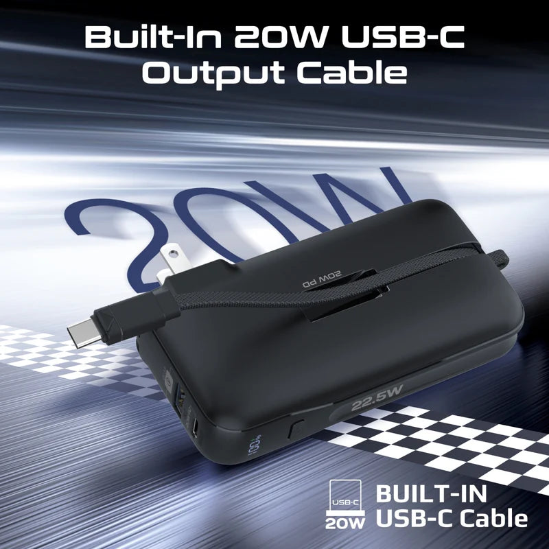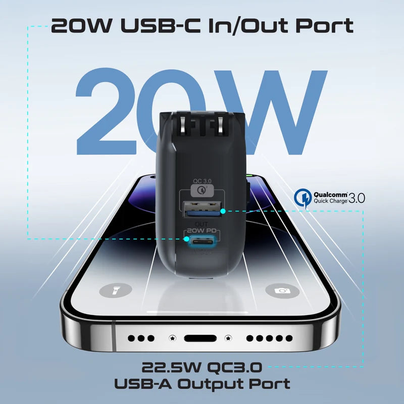 Streamline your on-the-go charging experience with the PowerPack-10C by Promate, the ultimate ultra-compact wall charger and power bank. Boasting a powerful 10000mAh battery capacity and a sleek design, this versatile charging solution features a 20W USB-C in/out port, a 22.5W QC3.0 USB-A output port, built-in 20W USB-C output cable and an integrated USA 2-pin AC plug, plus 2-pin EU and 3-pin UK plug adapters for international AC charging in over 195+ countries. The AC/DC dual mode charging input ensures versatility, while the simultaneous charge and discharge feature keeps your devices powered up without interruption. With automatic voltage regulation and a robust multi-protection system safeguarding against overcharge, over discharge and over-heating you can trust the PowerPack-10C to deliver reliable and efficient charging. Plus, the intuitive digital display keeps you informed of your power status at a glance. Power up with confidence and convenience with Promate’s PowerPack-10C.