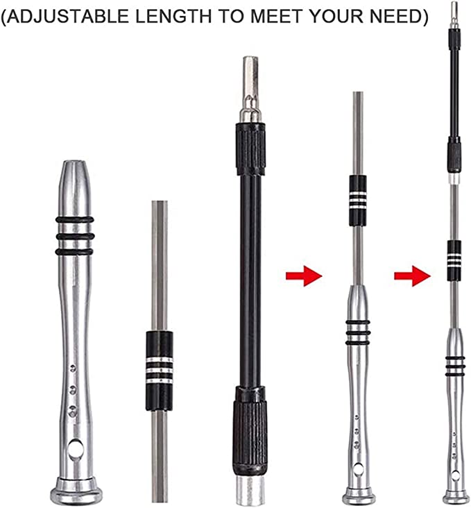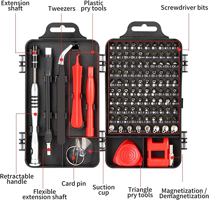 100-In-1 Screwdriver Kit The 110 In 1 Tool Set Includes 98 Special Precision Bits, Magnetized Driver Handle, Flexible Extension The Handle Has A Universal Hose Design, Which Is Comfortable To Touch, Humanized Design, And Contains A Screwdriver With A Magnetic Tip And Anti Slip Function, Allowing You To Operate The Device Without Causing Any Damage. These Screwdriver Bits Are Made Of Durable, High Performance Stainless Steel. It allows you to do various projects, such as repair of watches, mobile phones, cars, televisions, computers, glasses, PS4 camera Xbox controller and other electronic devices.