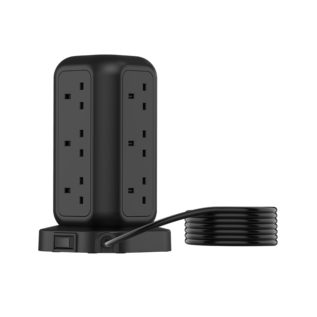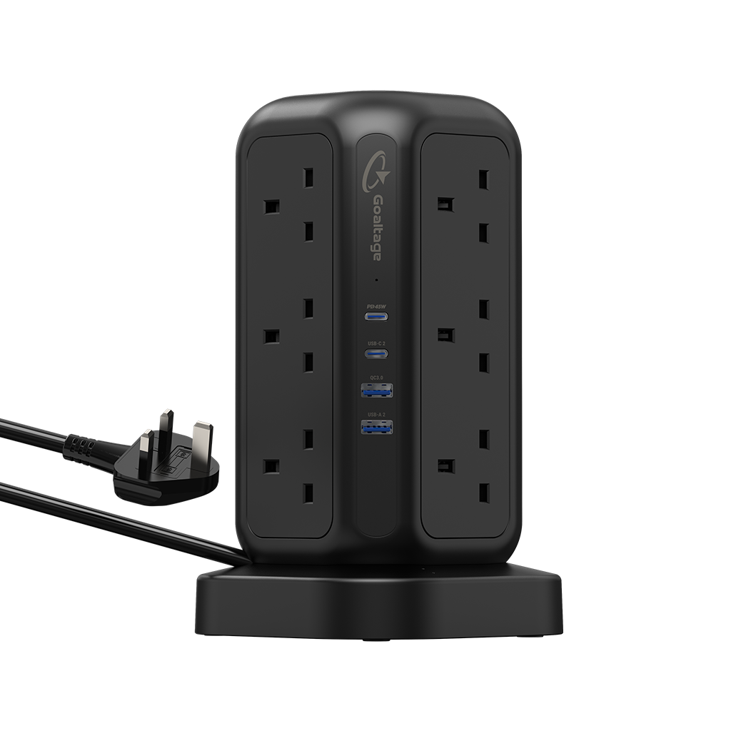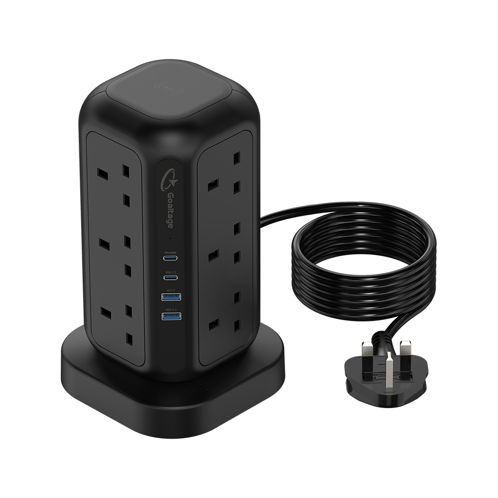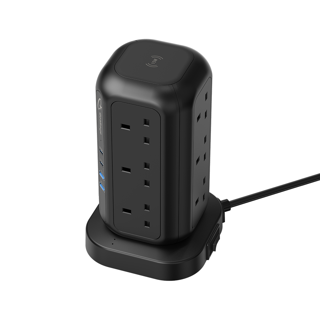In addition to its remarkable wireless charging capability, the EXT01 PowerStrip Tower 3250W GaN Extension boasts 12 UK-pin AC Outlets strategically positioned to accommodate larger plugs. It also features 2 USB-C and 2 USB-A ports, all equipped with GaN technology, ensuring rapid and secure charging for your devices.