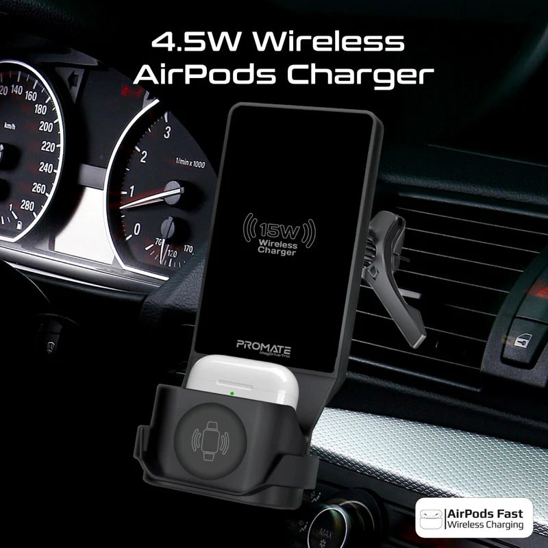 Introducing MagDrive-Trio, the ultimate 3-in-1 car charging station designed to meet all your on-the-go power needs whilst driving. With its versatile mounting options for your windshield, dashboard, or AC vent, MagDrive-Trio keeps your devices within reach while driving. MagSafe compatibility ensures seamless attachment for your iPhone, while the 15W wireless phone charger keeps it powered up fast. Additionally, with a 4.5W wireless AirPods charger and a 3.5W wireless watch charger, you can keep all your essential Apple devices charged simultaneously. Its elegant design complements any car interior, and the colorful LED light indicator adds a nice ambiance. Plus, with a 1m cable included, you have everything you need for a clutter-free charging experience on the road. MagDrive-Trio: where versatility and convenience converge.