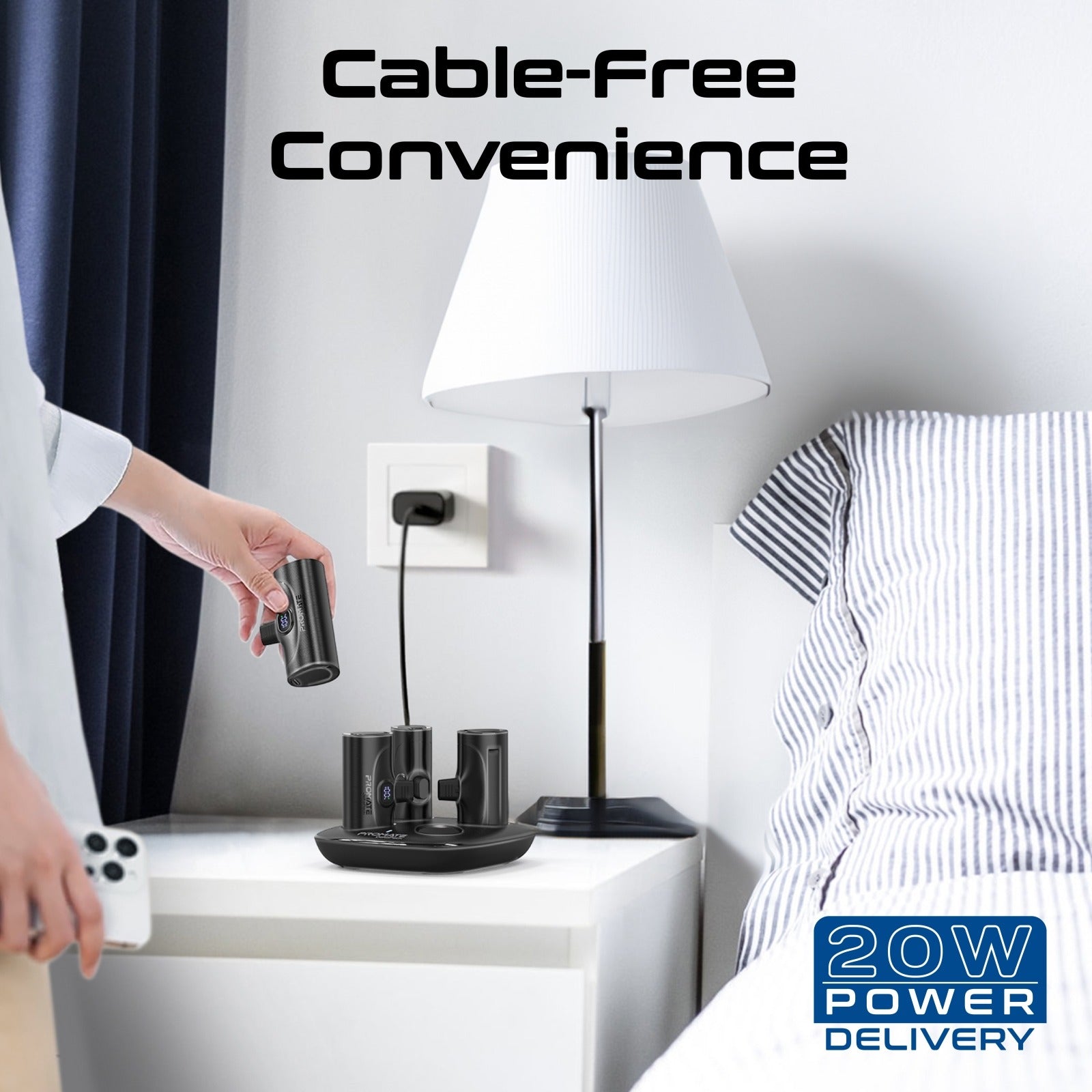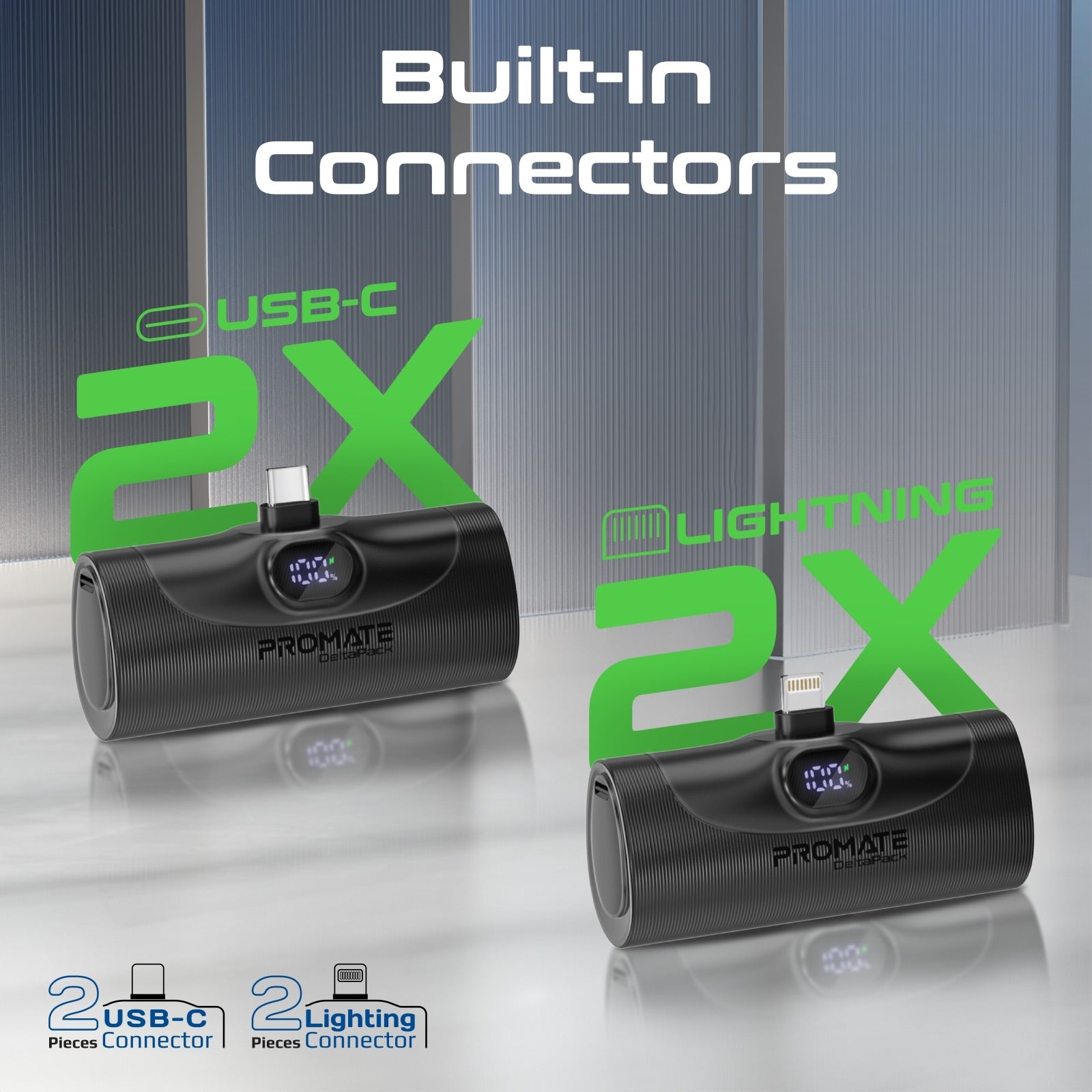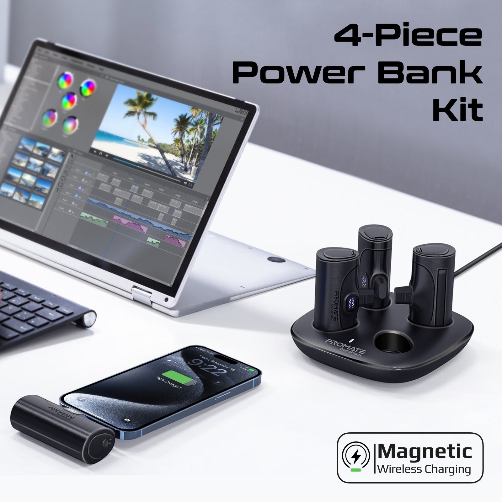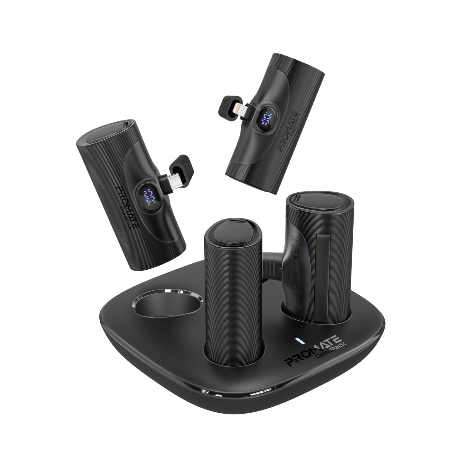 4-Piece Power Bank Kit: DeltaPack includes four compact and portable chargers and a sleek and stylish charging dock to power both Android and Apple iPhones with ease. Built-In Connectors: Forget the hassle of carrying extra cables as DeltaPack features 4 mini power banks with 2 each built-in USB-Cand Lightning Power Delivery connectors. Powerful Battery Capacity: DeltaPack boasts 4 individual 5000mAh lithium-ion backup battery packs, so you can keep your devices powered up, anywhere, anytime. Cable-Free Convenience: Say goodbye to tangled cables! This cordless charging kit allows you to plug and play without any hassle. The charging dock can conveniently charge the 4 mini power banks simultaneously US Multi Protect System: DeltaPack ensures safe and dependable charging, as it features over-charging and high-voltage protection. Light Bat Smart LED Screen: Featuring an LED screen, it will keep you informed on the Batt charge left on your DeltaPack power bank Pog Foldable Kickstand: Each of the stylish power banks also features a foldable kickstand, that offers stable charging as well enhanced viewing, for your USB Lightr smartphones. Ultra-Compact Design: Lightweight and portable enough to put in your pocket, place in your bag, or use on the go.